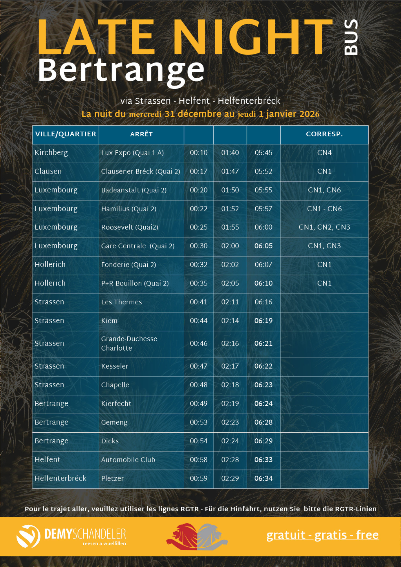 Le Late Night Bus Bartreng circulera exceptionnellement plus tard dans la nuit du 31 décembre au 1er janvier. Attention aux changements d’horaires et d’arrêts.