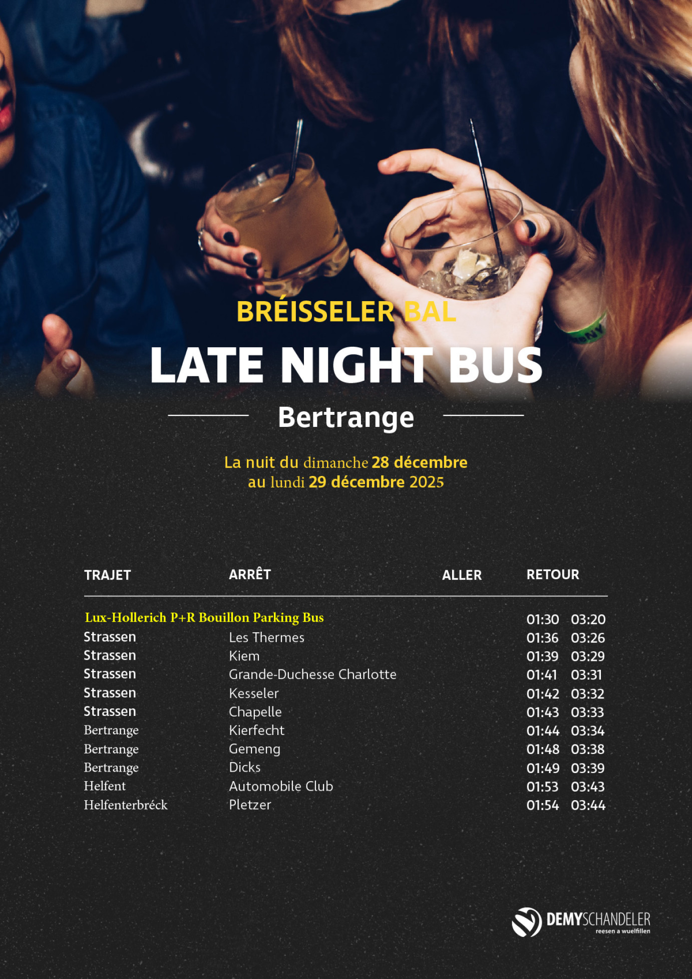 Le Late Night Bus Bartreng circulera exceptionnellement dans la nuit du 28 au 29 décembre à l’occasion du Bréisseler Bal. Attention aux changements d’horaires et d’arrêts.