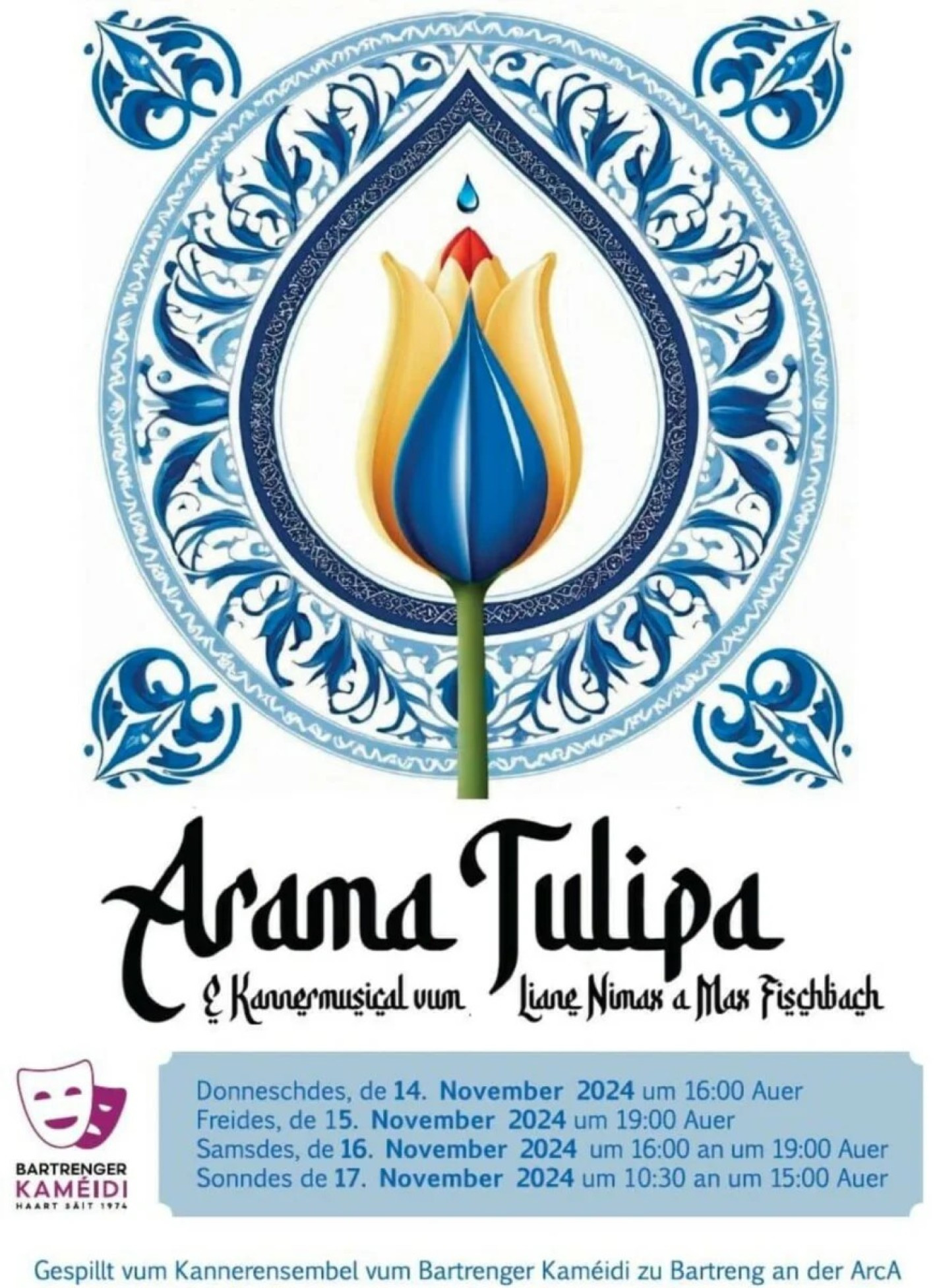 No der Opféierung vun der Kuerzversioun vun ARAMA TULIPA am Kader vun eisem Festival am Mee, presentéiert eise Kannerensembel iech dës Kéier de komplette Musical. Loosst iech verzaubere vun eise klengen Artisten a kommt mat hinnen op d’Sich no der Wonnerblumm.