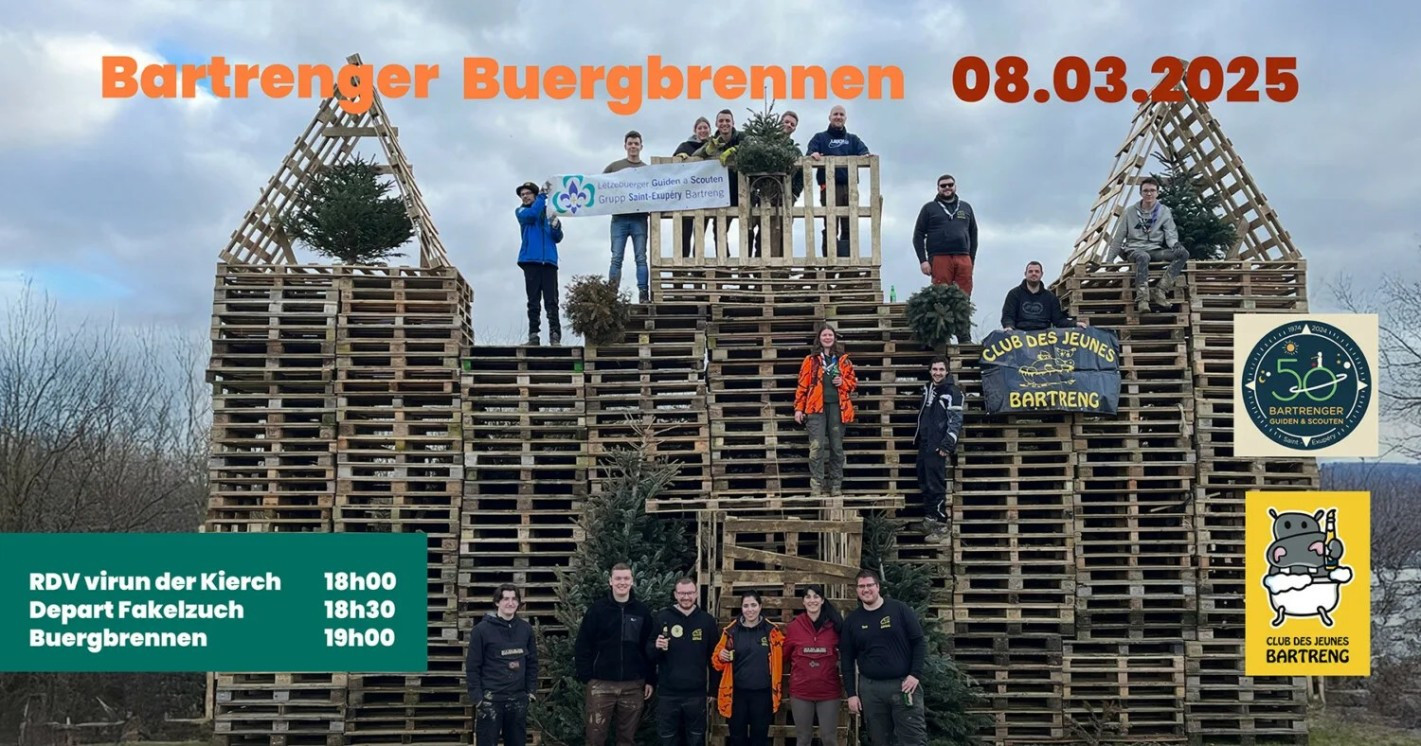 🔥Den EntrĂ©e ass fräi an Dir kĂ«nnt ab 18h00 op de Site luusse kommen. RDV virun der Kierch zu Bartreng ass um 18h00. Den DĂ©part vum Fakelzuch ass um 18h30 an d’Buerg gĂ«tt gĂ©int 19h00 ugefaangen. Fir Iessen a GedrĂ©nks ass gesuergt.đźŚđźŤ»