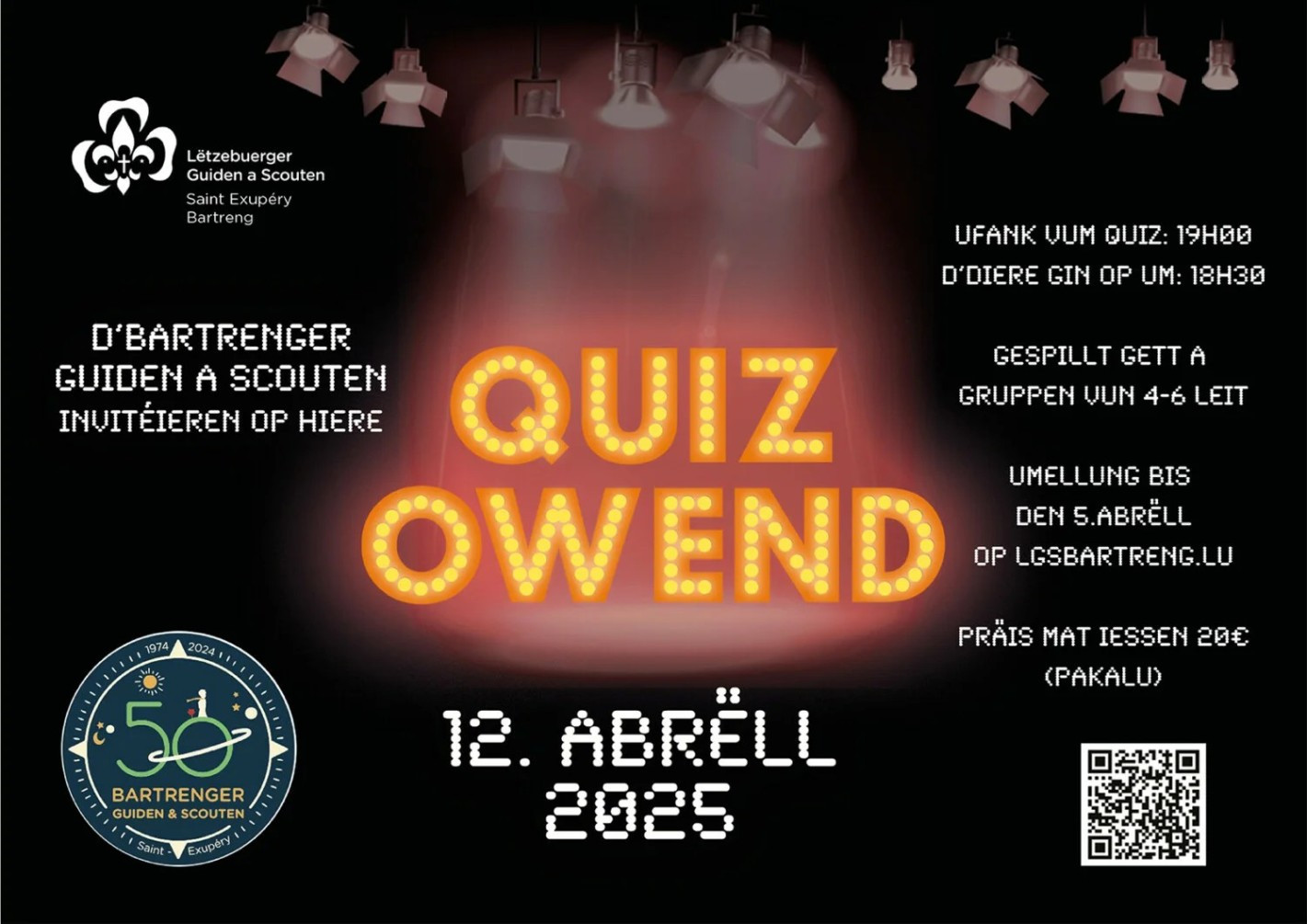 D’Bartrenger Guiden a Scouten invitéieren dech, deng Famill a Kolleegen op eisen Quizowend, den 12. Abrëll am Centre Atert. Mell dech an deng Equipe op eiser Homepage un, wann dir Loscht hutt, iech zesummen iwwert spannend Froen de Kapp ze zerbriechen.