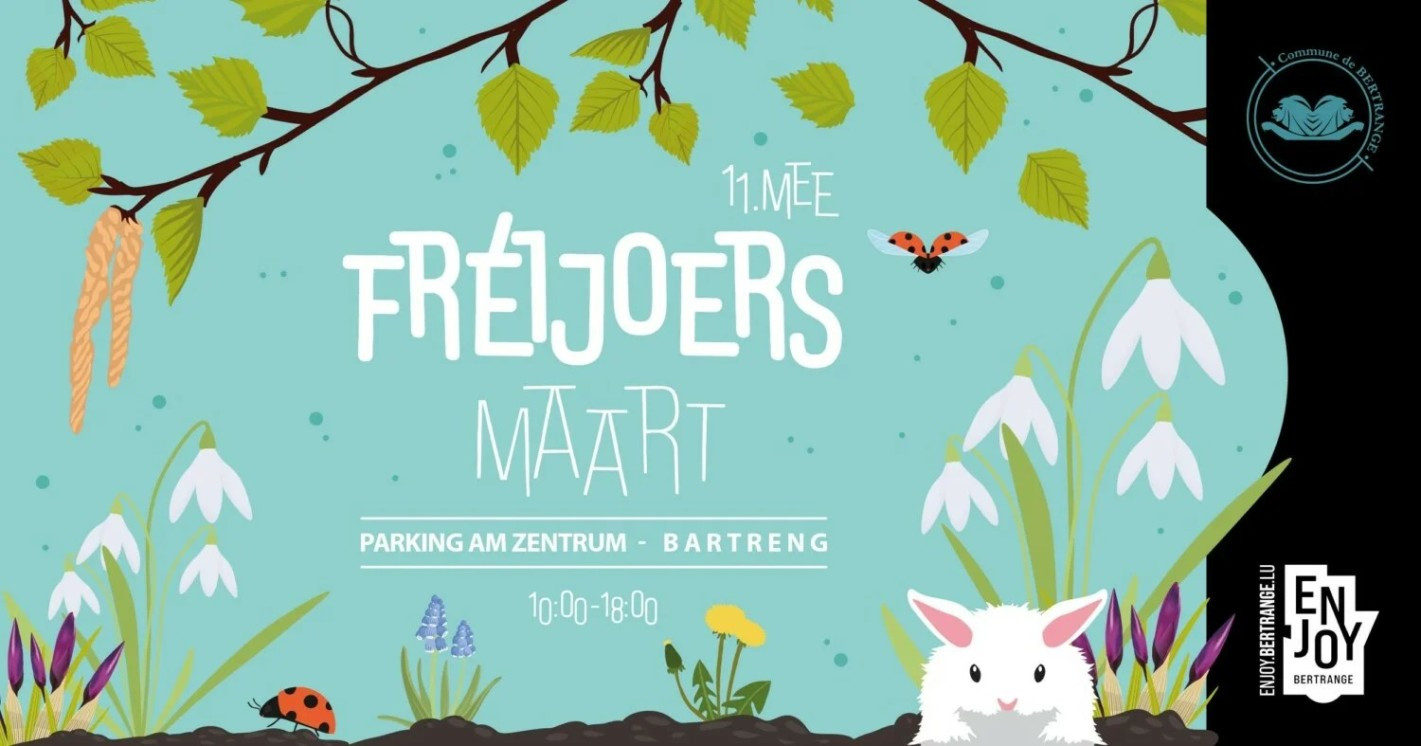 🇱🇺 De Bartrenger Fréijoersmaart steet virun der Dier! Kommt den 11. Mee op de Parking Am Zentrum an entdeckt vill flott Stänn mat frëschen a lokale Produiten. Verpasst och net Är Kanner fir e Blummenatelier mam Petra Tetzlaff anzeschreiwen (Email u [email protected]).
