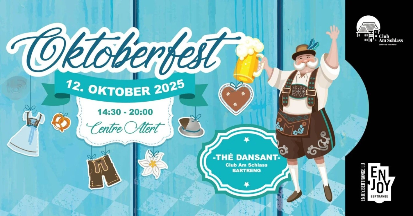 Et ass erëm esou wäit d’Danzschong auszepaken. Mir invitéieren Iech häerzlech op e festlechen Thé Dansant, inspiréiert vum bayreschen Oktoberfest, mee mat engem flotte lëtzebuergeschen Touch. Kommt feieren, danzen a genéissen an enger gemittlecher Atmosphär. Fir Iessen an Drénken ass gesuergt.