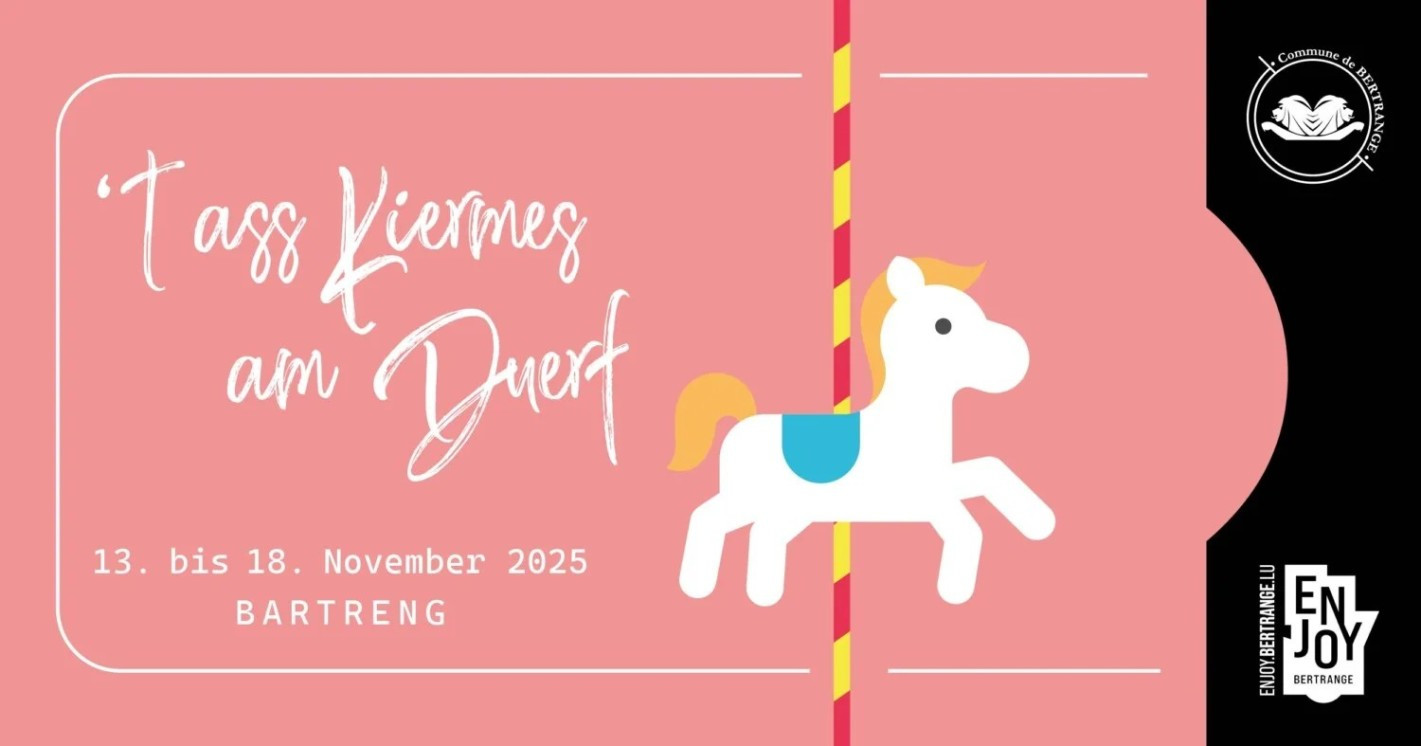 đ±đș MĂ«tt November heescht et rĂ«m ât ass Kiermes am Duerf zu Bartreng. Vum 13ten bis 18ten November fannt dir all Dag vu 16.00 bis 21.00 um Parking Am Zentrum fill flott Attraktiounen a StĂ€nn.