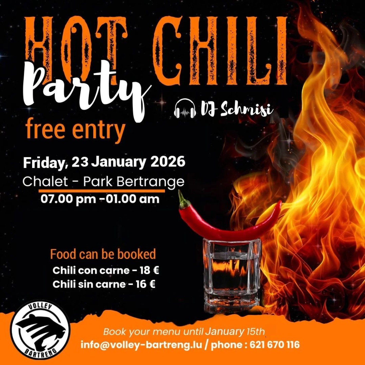 Chili con carne / sin carne – réservation souhaitée pour le chili (jusqu’au 19.01.2026, tél. 621670116, [email protected]) ensuite Party avec DJ Schmisi – entrée libre