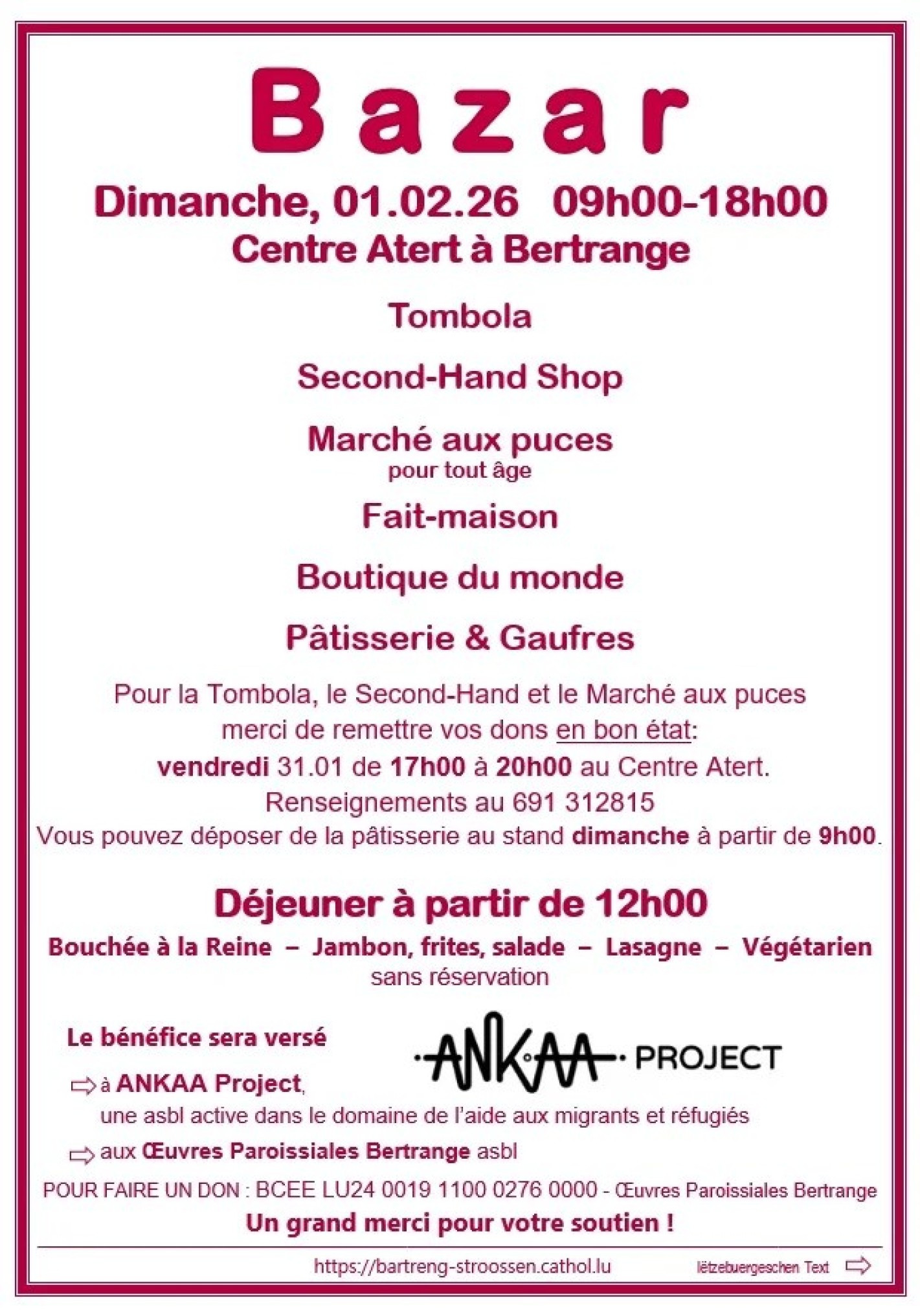 tombola, second-hand, marché aux puces, do-it-yourself, Boutique du monde, déjeuner et pâtisserie