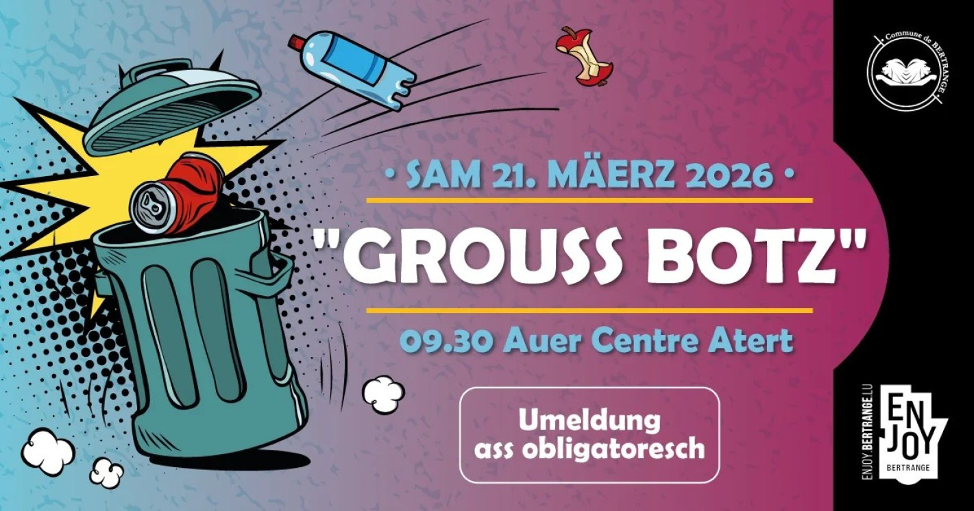 🇱🇺 Op Initiativ vun der Natur- an Ëmweltkommissioun, mécht de Schäfferot en häerzlechen Opruff un d’Awunner vu Bartreng, un d’Bartrenger Veräiner an un all déi Leit, déi sech fir eng propper Ëmwelt asetze wëllen, un der Aktioun „Grouss Botz“ um Bartrenger Territoire deel ze huelen.